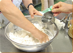 ![]() | 4) もち米粉に水をいれて、こねます。かためのだんごが好みの人は、うるち米粉(もち米粉の1割を目安)を入れてください。 |